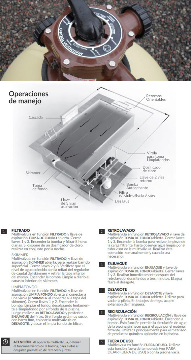 In modern swimming pools we find the valve or 6-way tap next to the filter that controls the different maintenance operations in the circuit; wash, rinse, empty, recirculate or by-pass…etc. To understand how it works we leave the following scheme: