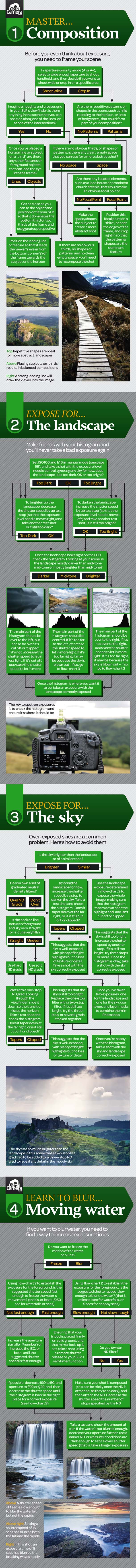 In the world of natural landscape photography there are much to learn and manuals to read and reread. We contribute 10 images that are representative to start configuring and learn the photographic portrait in front of a landscape beautiful . (Some infographics are in English and others in Spanish but we believe that the essence of each one of they are understood. Clicking on the images opens a new window)… Today we learn how to photograph natural landscapes !